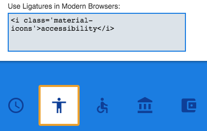 Les icônes sont disponibles dans la liste Google Material Icons. Vous pouvez voir la liste complète des icônes sur cette page