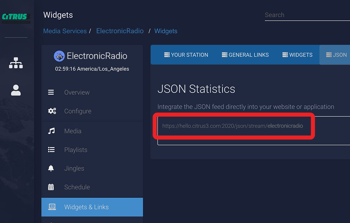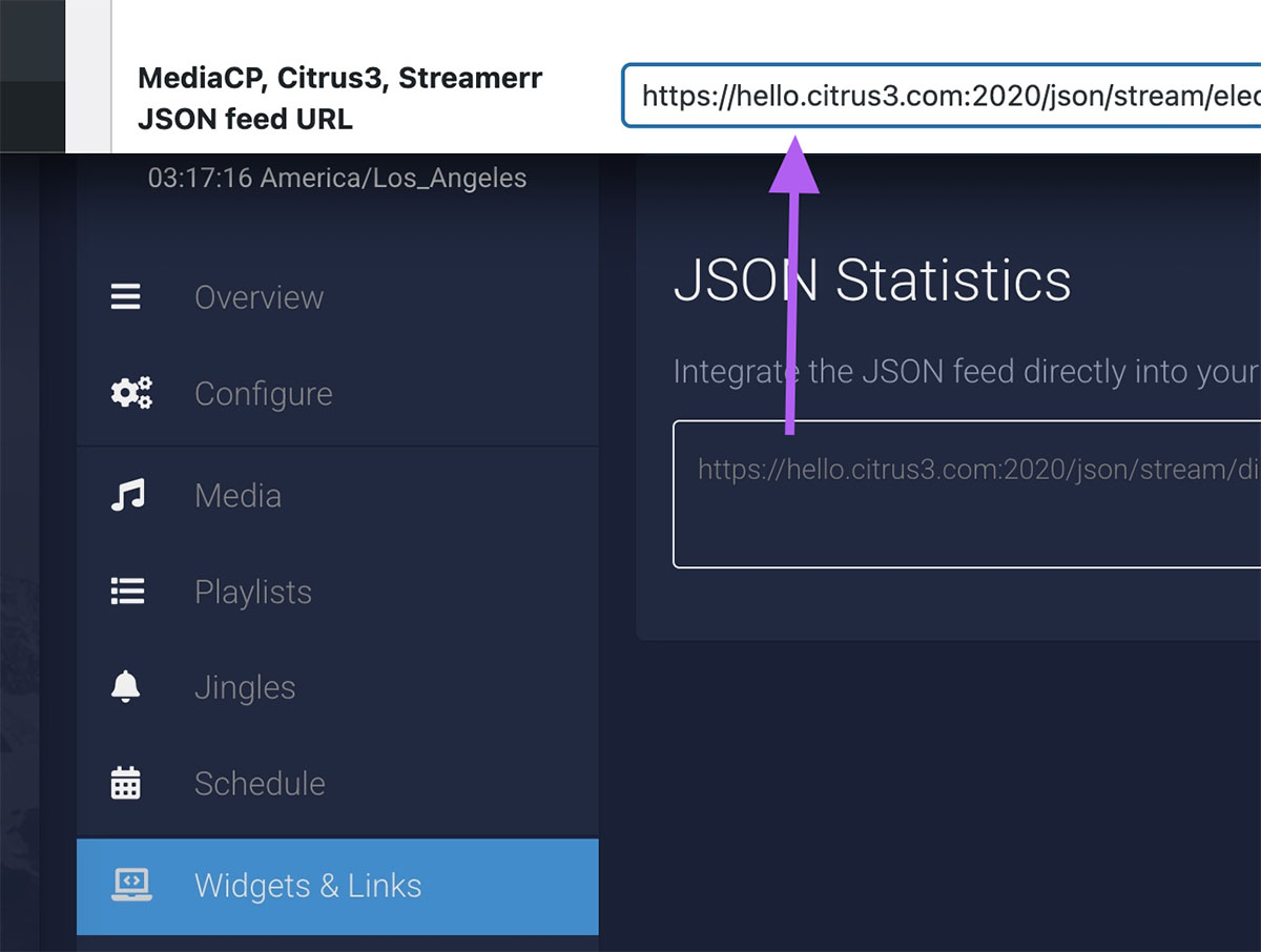 4) Paste the copied link in your radio channel options ( MediaCP, Citrus3, Streamerr JSON feed URL )